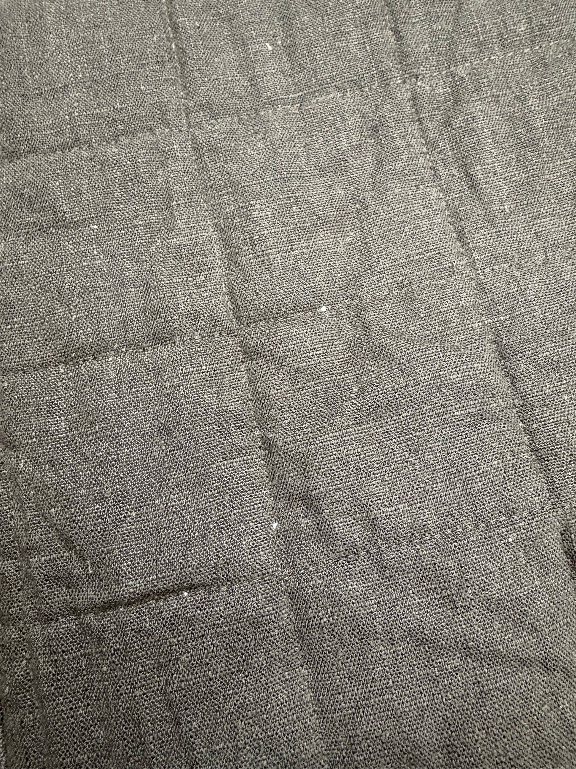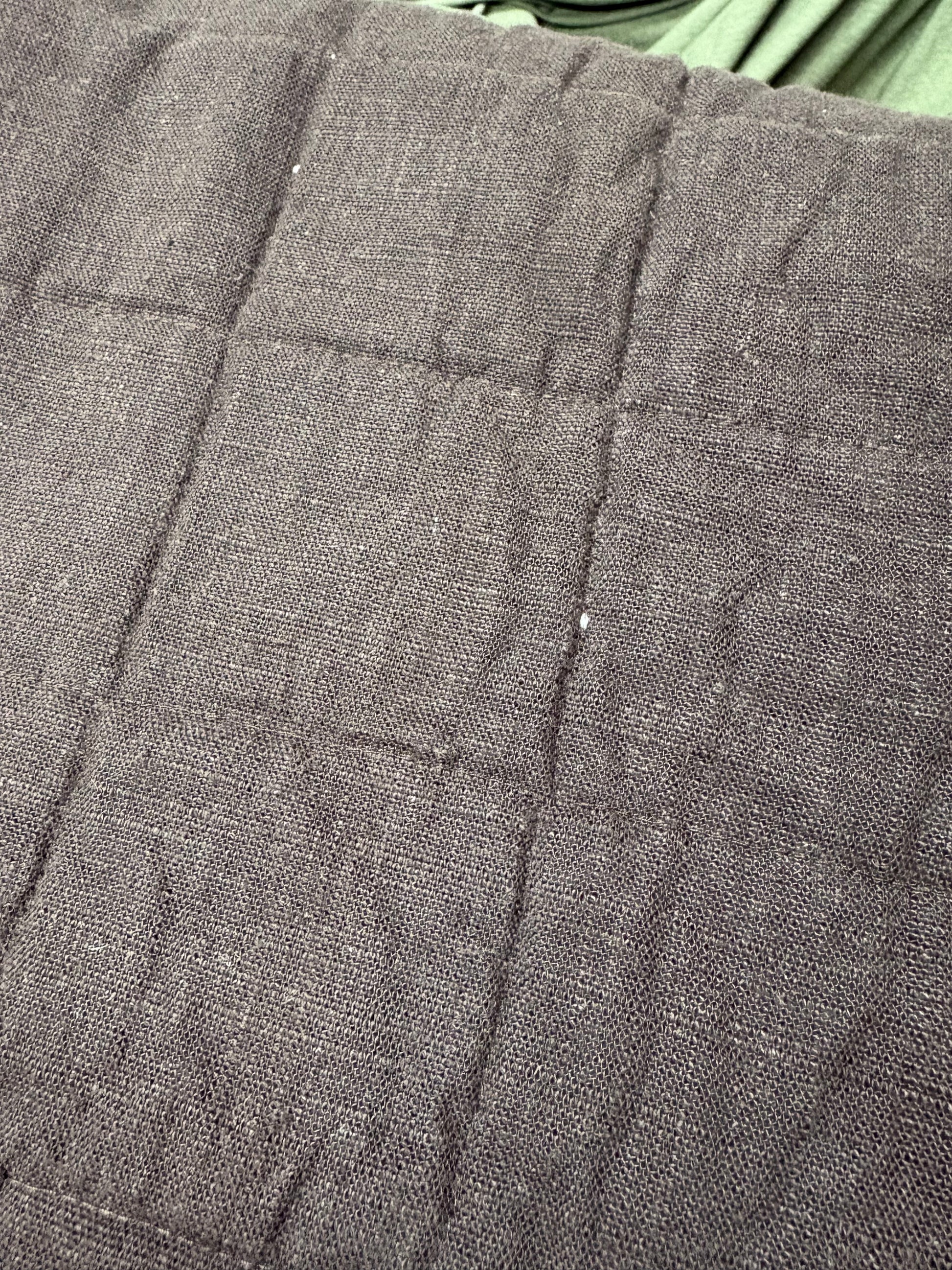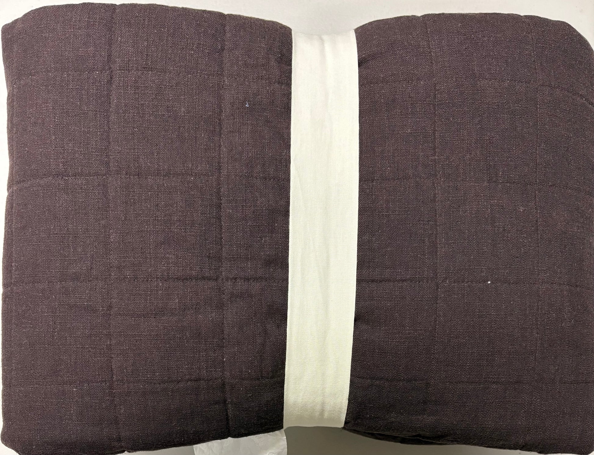 New without tags Casaluna Full/Queen Heavyweight Linen Blend Quilt & Shams Bundle in Dark Fig. Bundle includes one full/queen linen blend quilt and two matching standard shams. Linen & Rayon Blend, Cotton backing. Quilt does have a few defects: one stitching defect/tear in a small part of the seam, and several spots on the quilt where the white threading shows, both pictured.