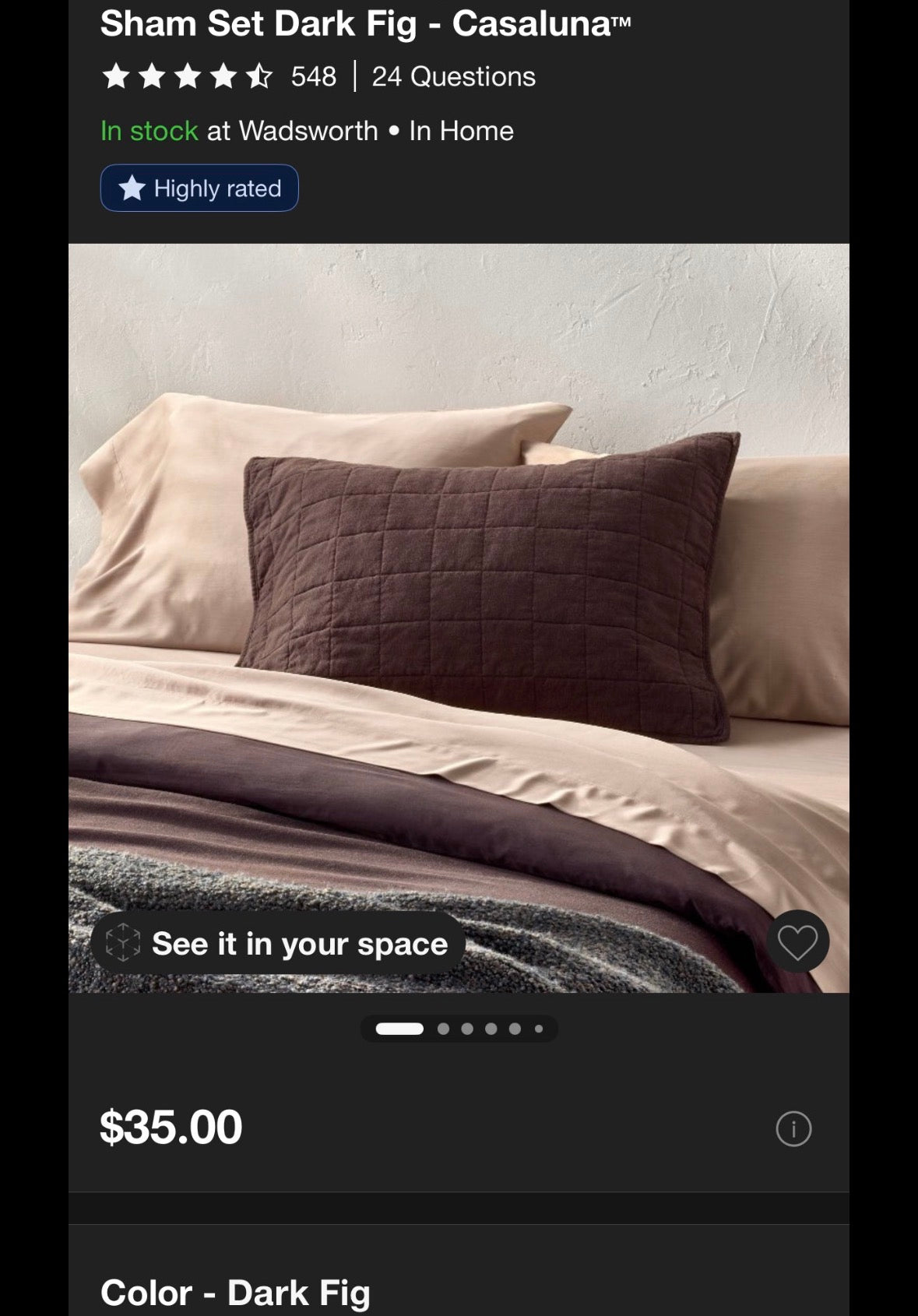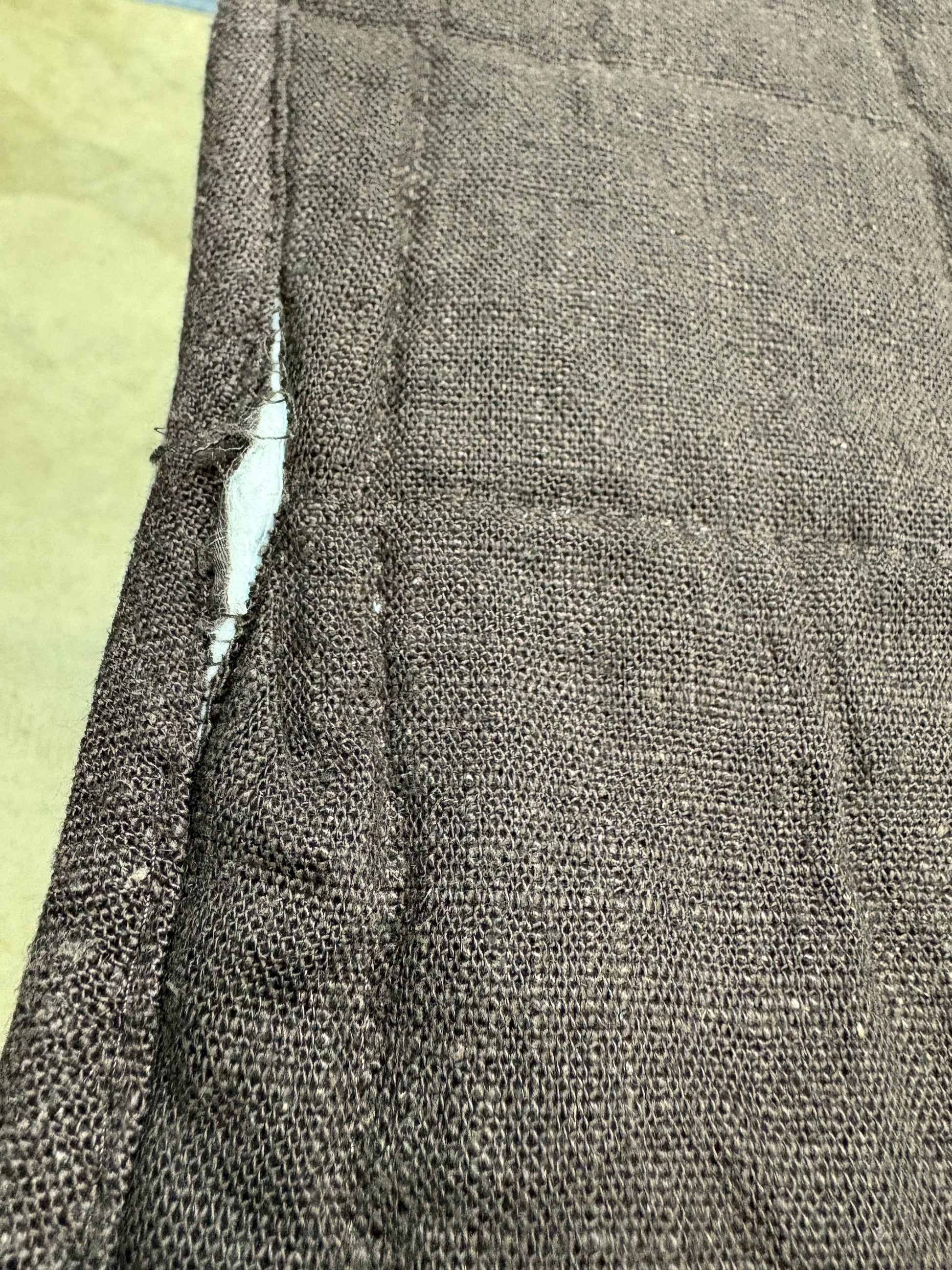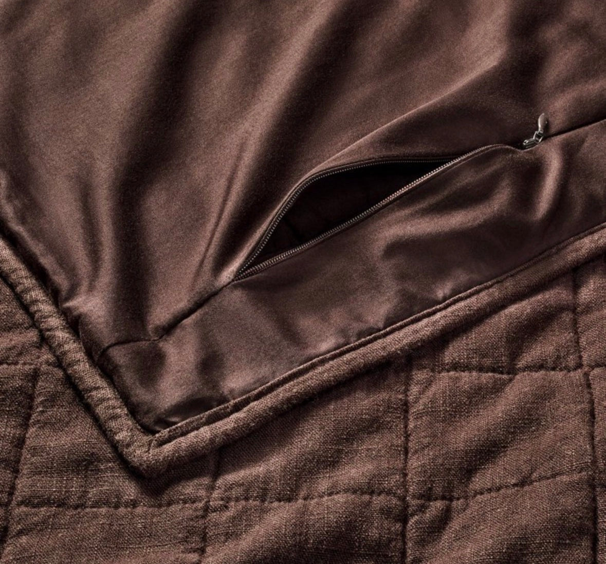 New without tags Casaluna Full/Queen Heavyweight Linen Blend Quilt & Shams Bundle in Dark Fig. Bundle includes one full/queen linen blend quilt and two matching standard shams. Linen & Rayon Blend, Cotton backing. Quilt does have a few defects: one stitching defect/tear in a small part of the seam, and several spots on the quilt where the white threading shows, both pictured.
