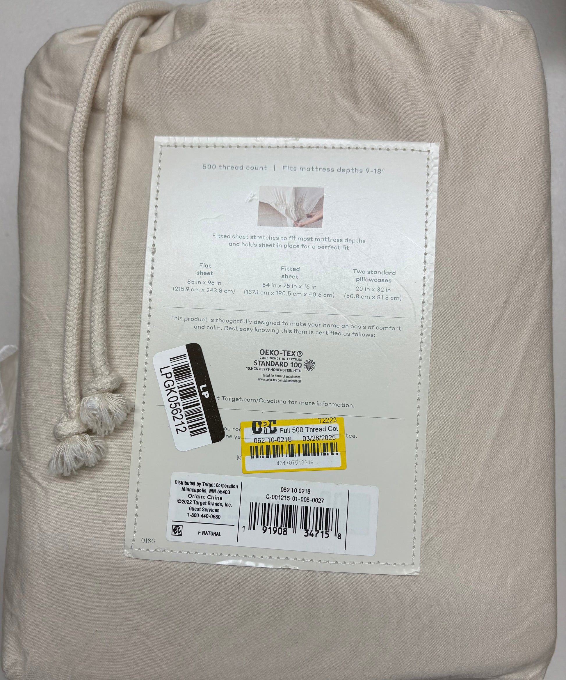 New with tags Casaluna Full Supima Sateen Sheet Set in Natural. Set includes one flat sheet, one fitted sheet, and two matching standard pillowcases. 500 thread count, 100% cotton.