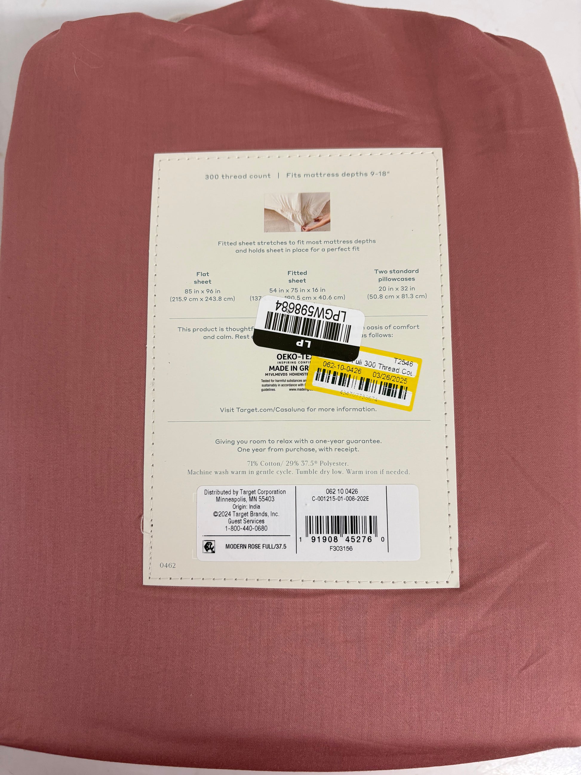 New with tags Casaluna Full Temperature Balancing Sheet Set in Rose. Set includes one flat sheet, one fitted sheet, and two matching standard pillowcases. 300 thread count.