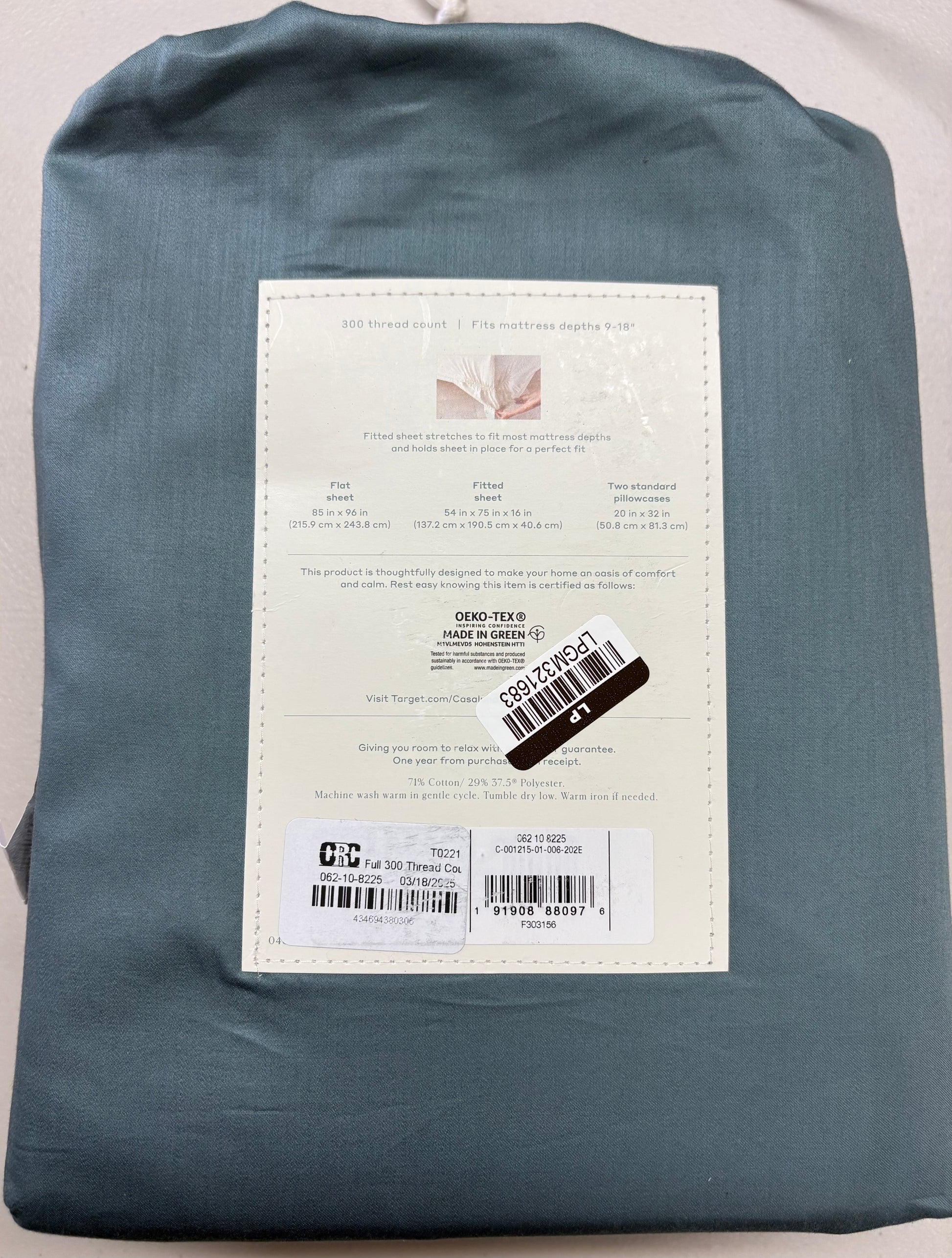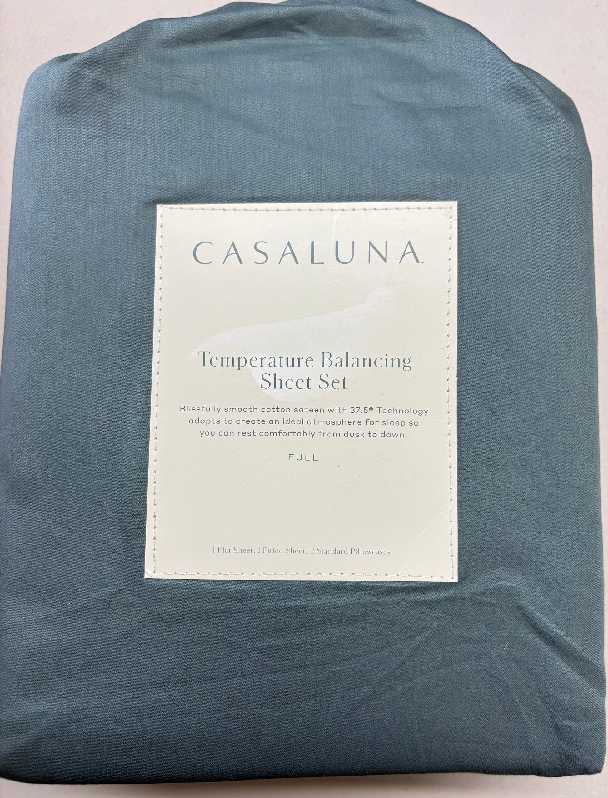 New with tags Casaluna Full Temperature Balancing Sheet Set in Teal Blue. Set inlcudes one flat sheet, one fitted sheet, and two matching standard pillowcases. 300 thread count, cotton blend.