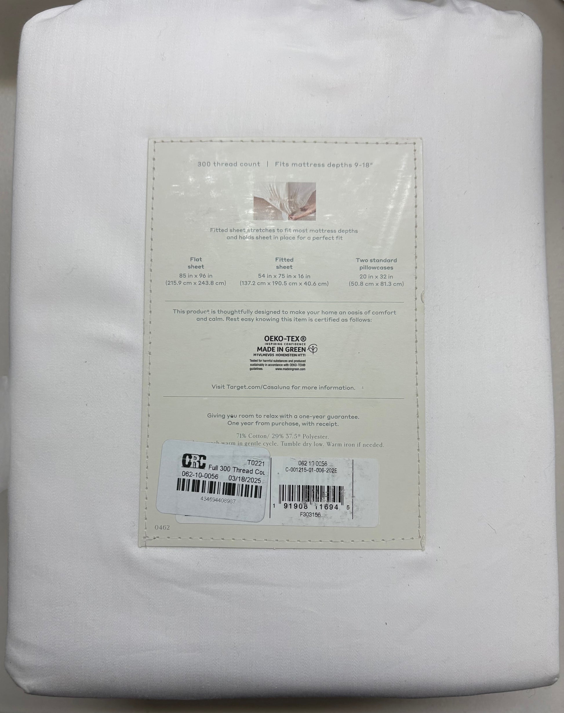 New with tags Casaluna Full Temperature Balancing Sheet Set in White. Set includes one flat sheet, one fitted sheet, and two matching standard pillowcases. 300 thread count, cotton blend.