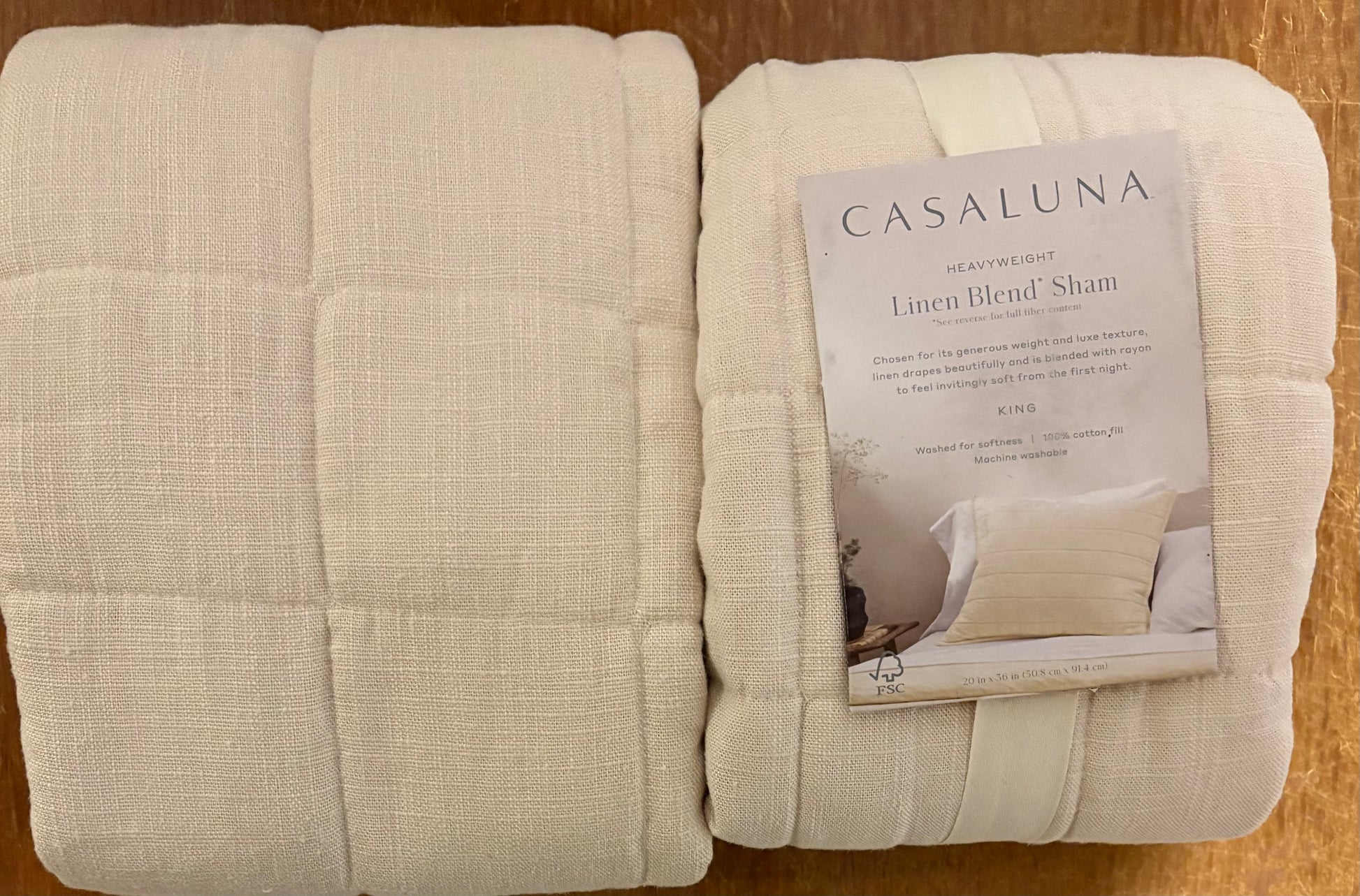 New without tags Casaluna King Heavyweight Linen Blend Pillow Sham Set in Natural. Set includes two matching king shams. Linen & Rayon blend. One small dirt spot on one of the shams, pictured.