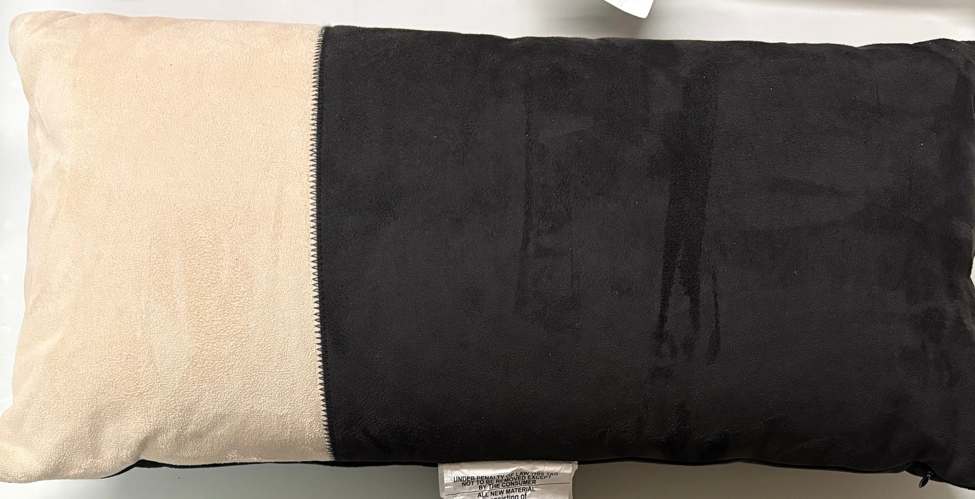 New with tags Threshold 12”x24” Lumbar Colorblock Faux Suede Throw Pillow Set in Black/Neutral. Set includes two matching throw pillows. One dirt spot on one of throw pillows. Removable zippered pillow cover, so should wash out easily.