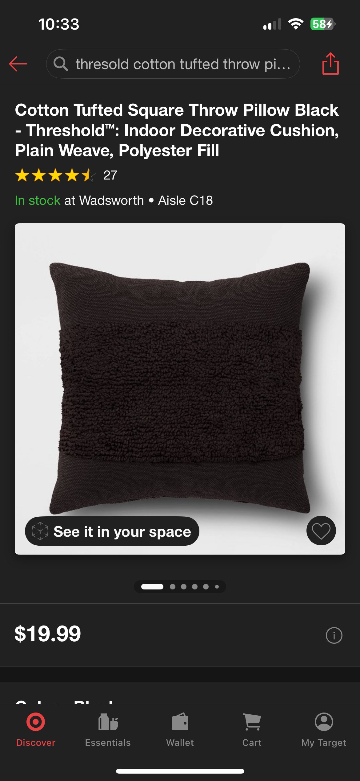 New with tags Threshold 18"x18" Tufted Throw Pillow in Black.