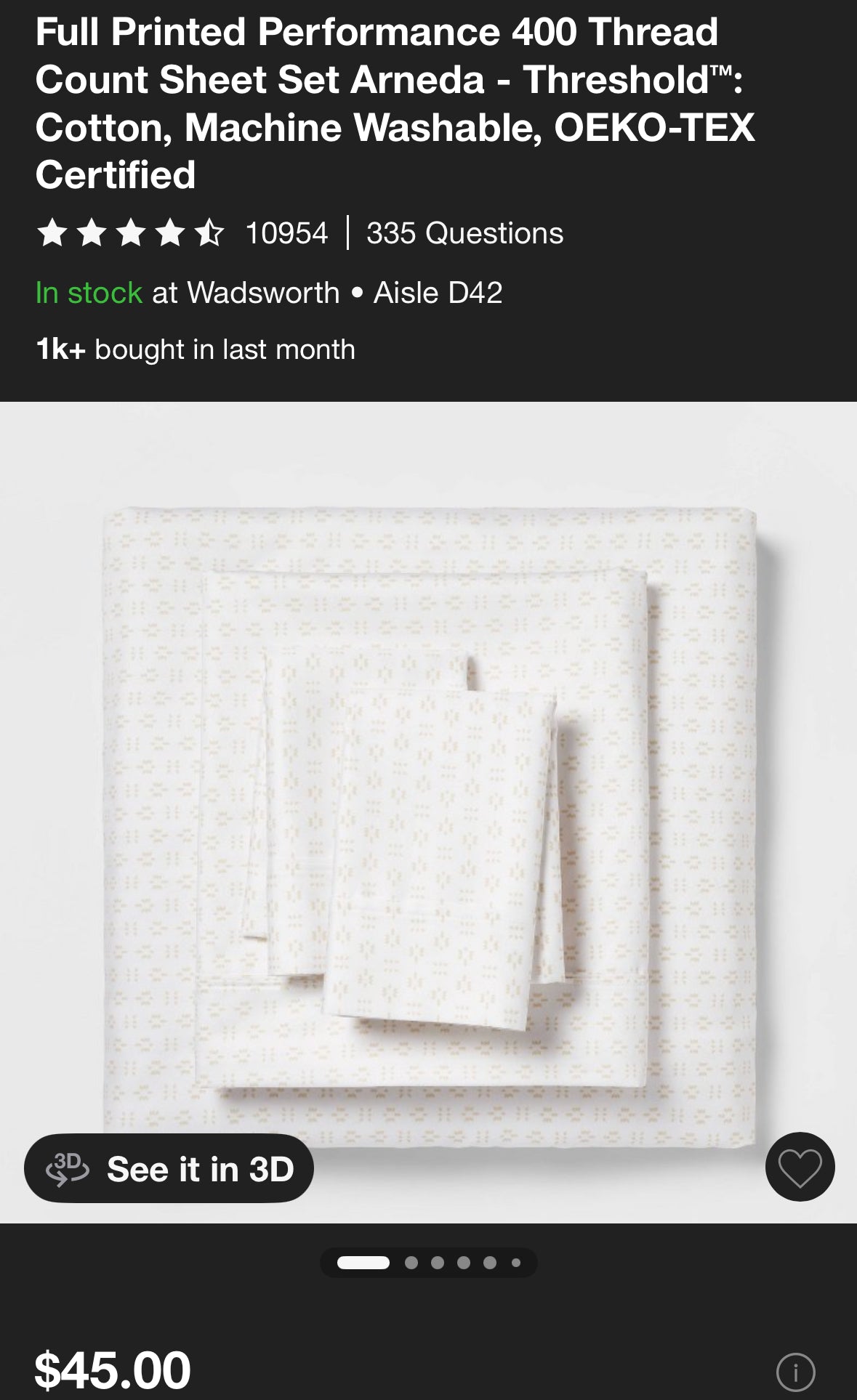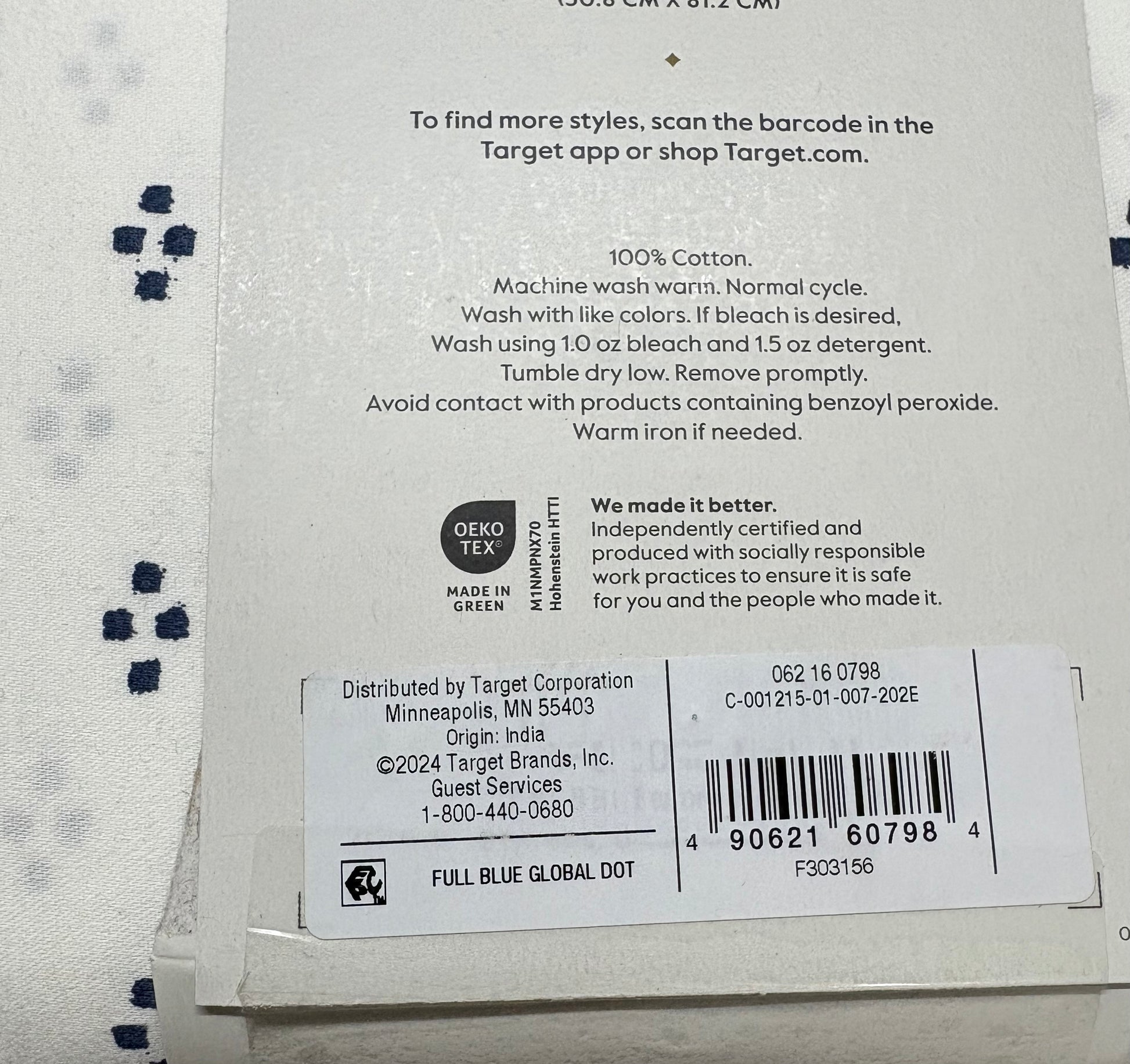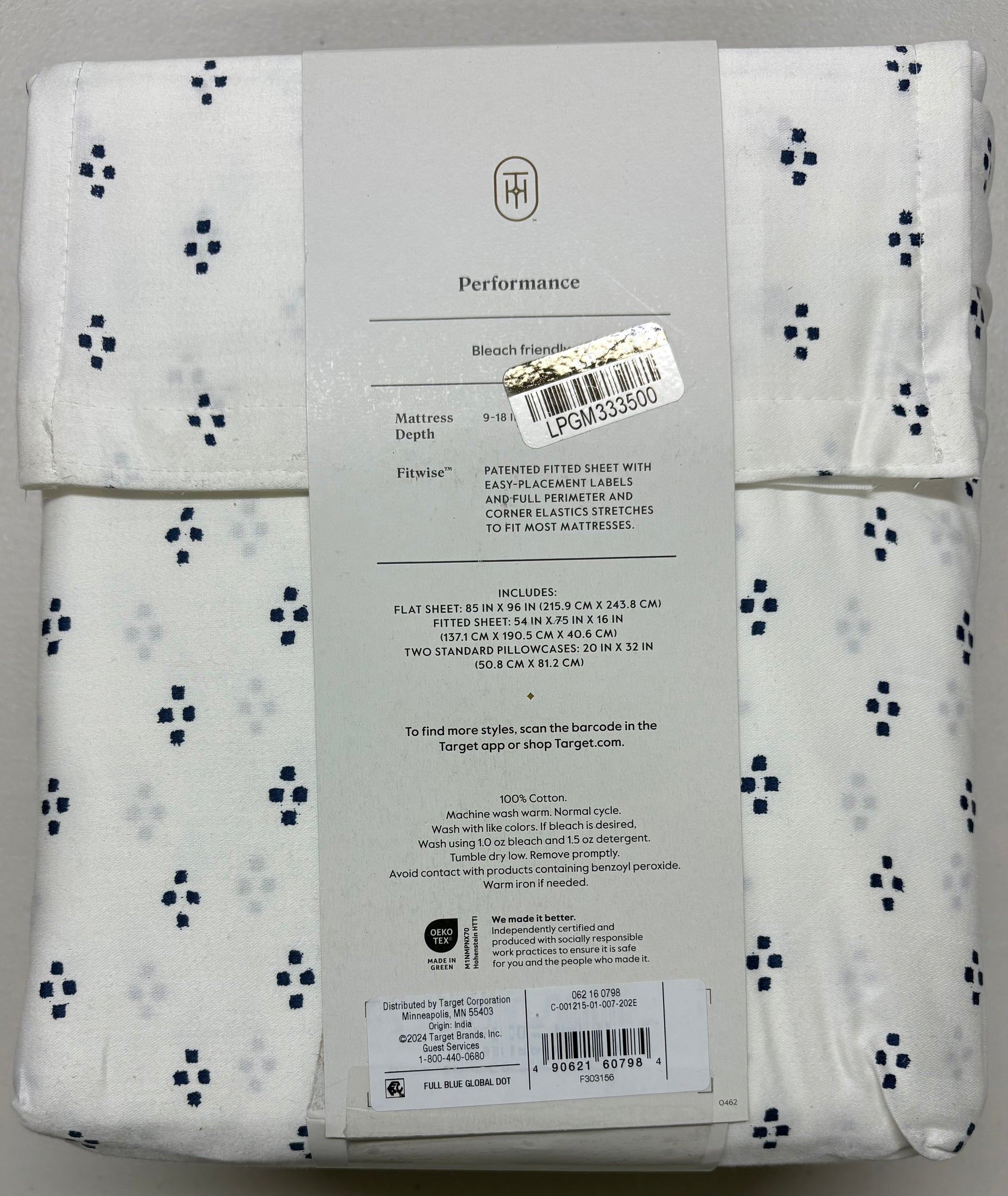 New WITHOUT tags Threshold Full Performance Sheet Set in Blue Global Dot. Set includes one flat sheet, one fitted sheet, and two matching standard pillowcases. 100% cotton, 400 thread count. This set is without paper tags (last picture).