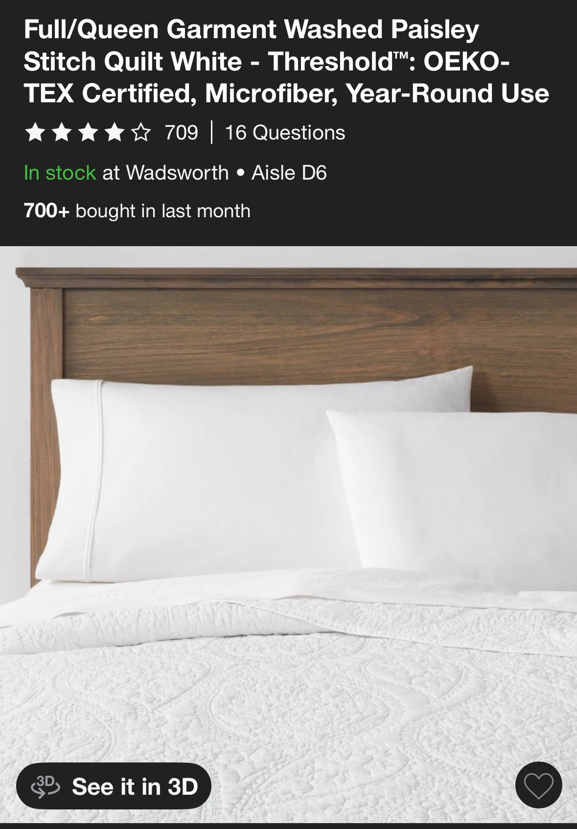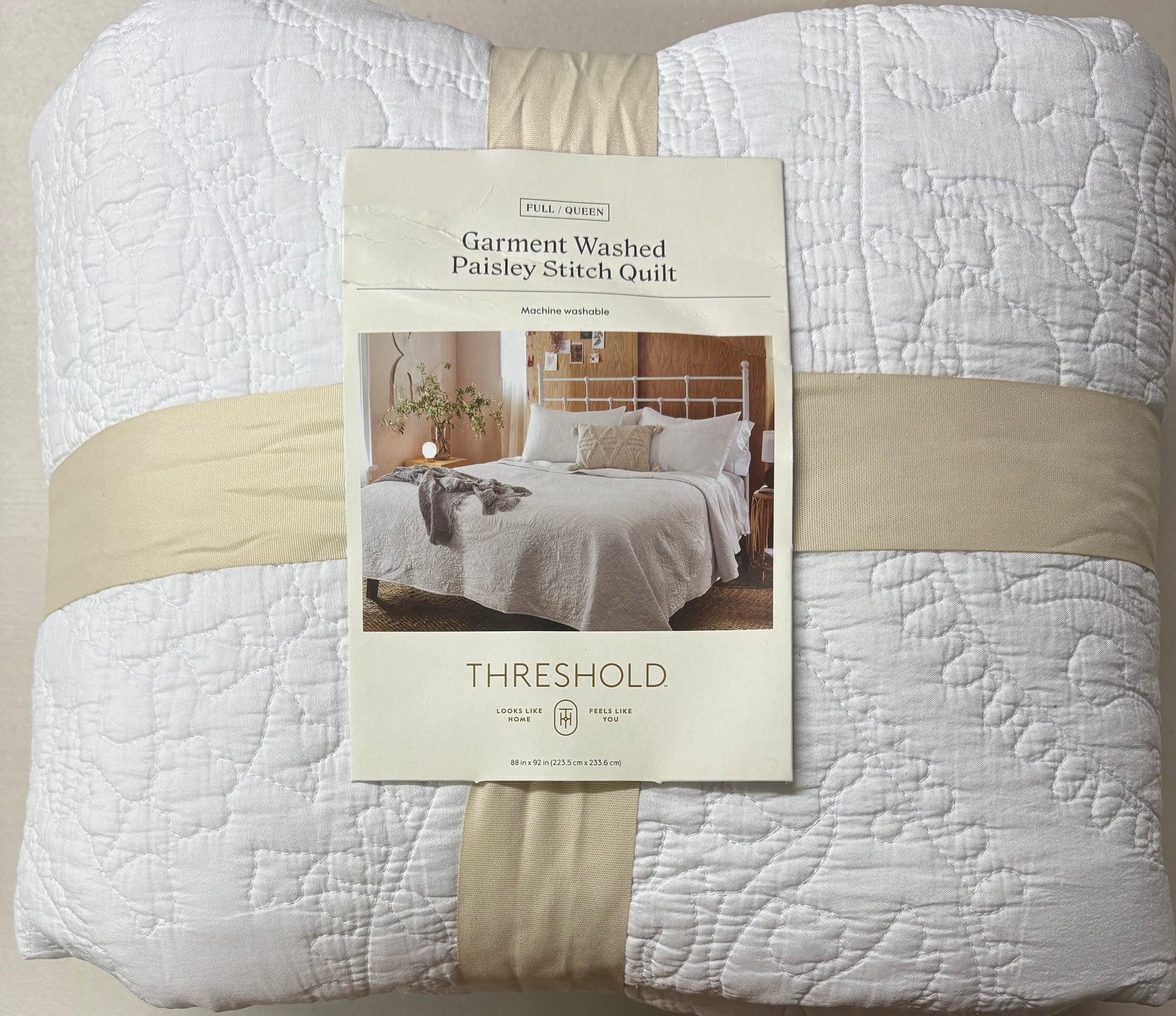 New with tags Threshold Full/Queen Garment Washed Paisley Stitch Quilt in White. Two small dirt spots, pictured.