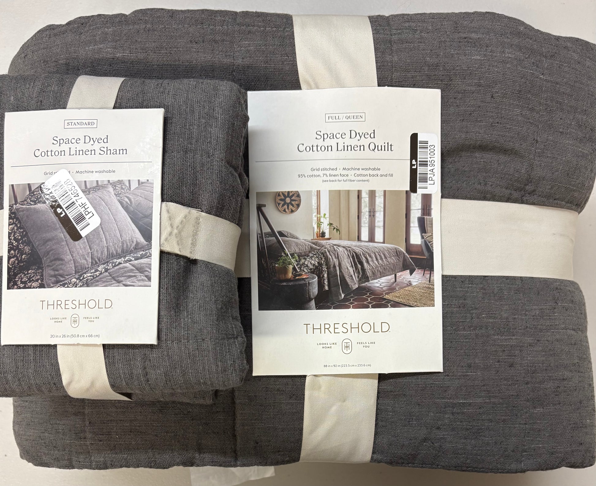 New with tags Threshold Full/Queen Space Dyed Cotton Linen Quilt & Sham Set in Dark Grey. Set includes one full/queen quilt & one matching standard sham. Cotton & Linen blend.