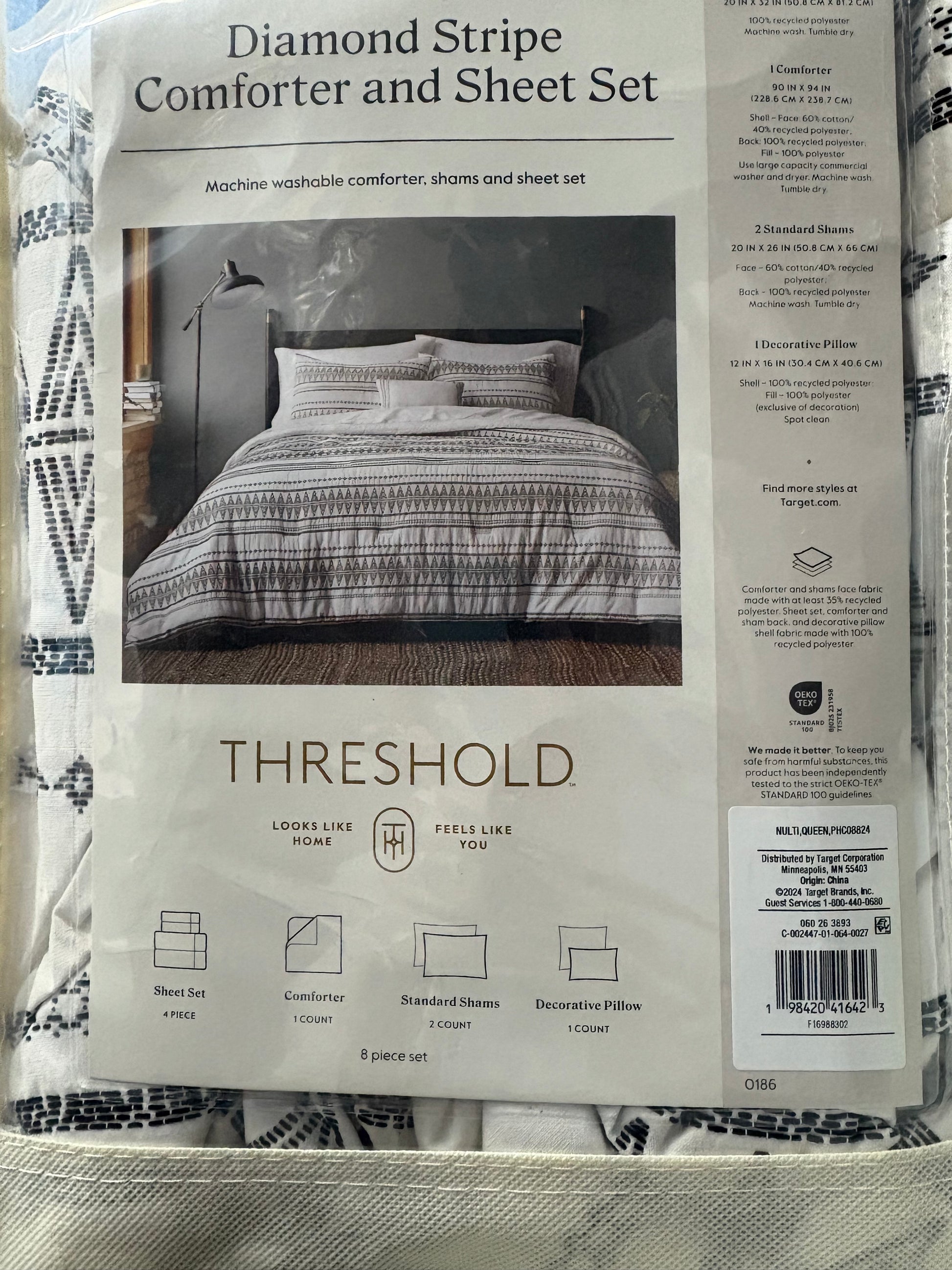 New with tags Threshold Queen 8 pc. Woven Diamond Stripe Comforter & Sheet Set in Black/White. Set includes one queen comforter, two standard shams, one fitted sheet, one flat sheet, two standard pillowcases, and one decorative throw pillow. The plastic case holding the set is ripped at the top, pictured.