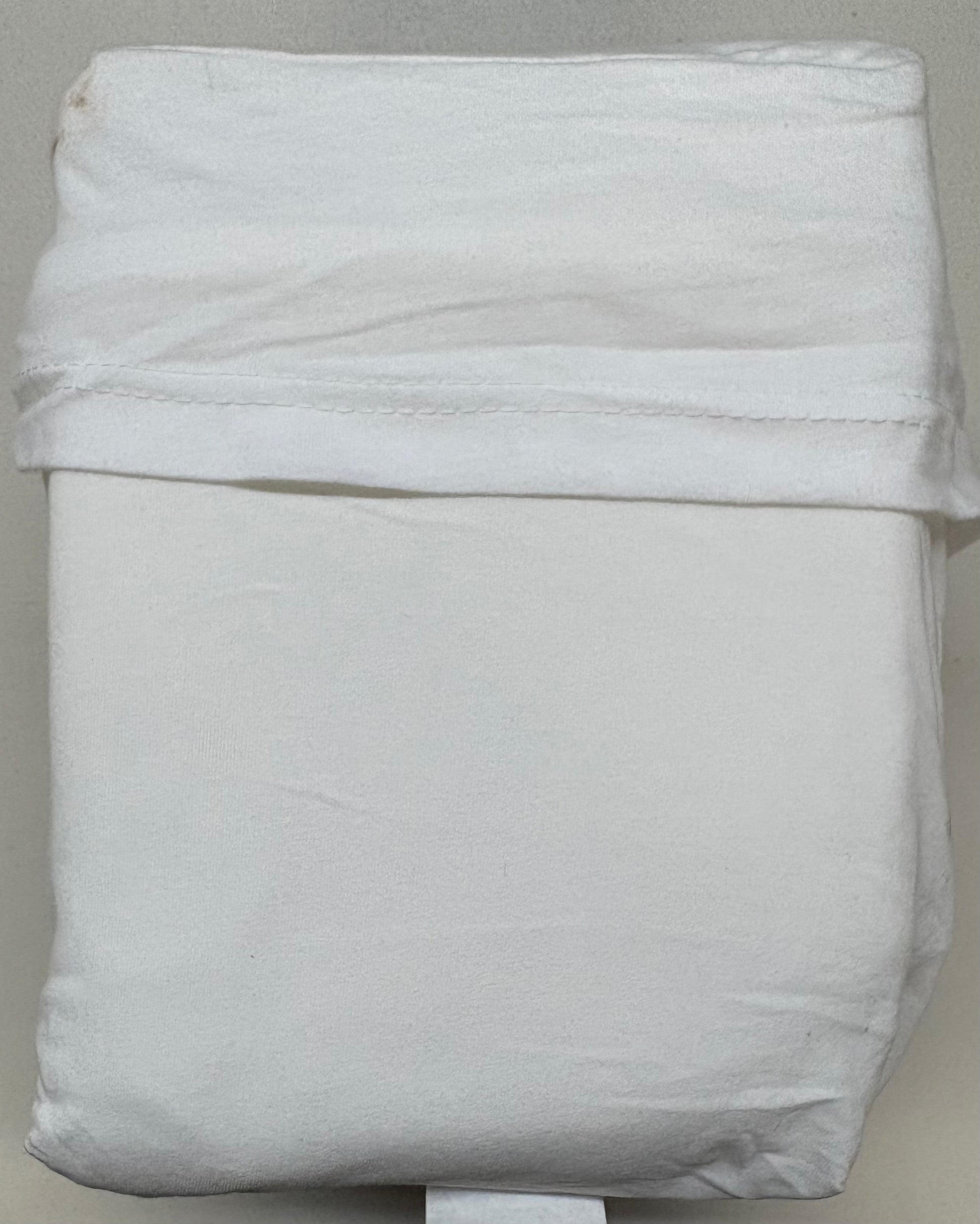 New without tags Threshold Queen Cotton Jersey Sheet Set in White. Set includes one flat sheet, one fitted sheet, and two matching standard pillowcases. 100% Jersey cotton. Two small dirt spots found: one is on bag holding sheet set and one is located on top sheet, both pictured.